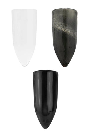 Ghostly Glam Halloween -lookimme yhdistää mysteerin ja aavemaisuuden tummiin sävyihin ja aavemaisiin kuvioihin. Mustat, magneettiset kynnet luovat syvyyttä ja draamaa – täydellinen valinta tyylikkääseen ja aavemaiseen Halloween-manikyyriin!